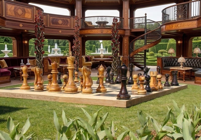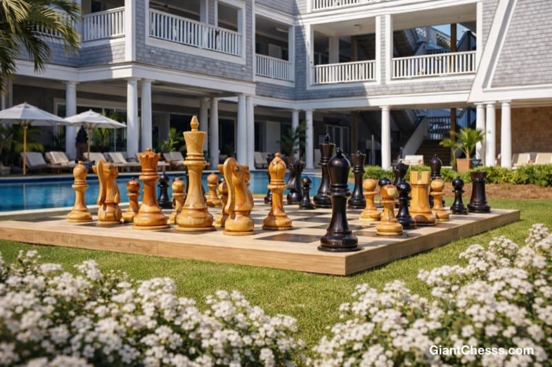 This 48" chess set, still with prized original teak as its main material, played on a chessboard with 24" x 24" squares, is quite dramatic in its presentation, whether located in expansive yard (see picture), house terrace, foyer, even large room with this as its central attraction.