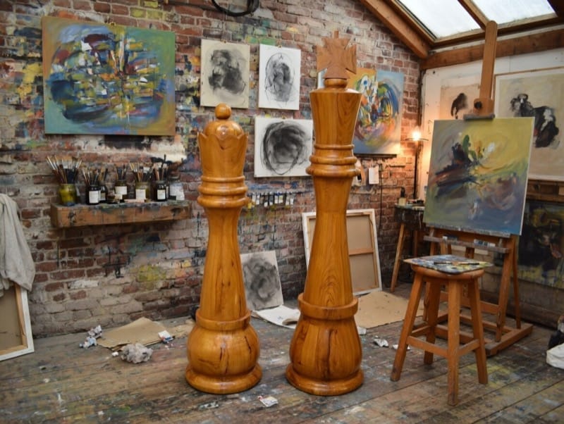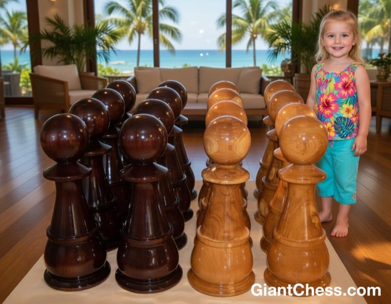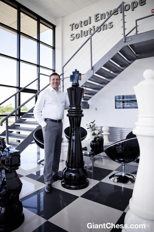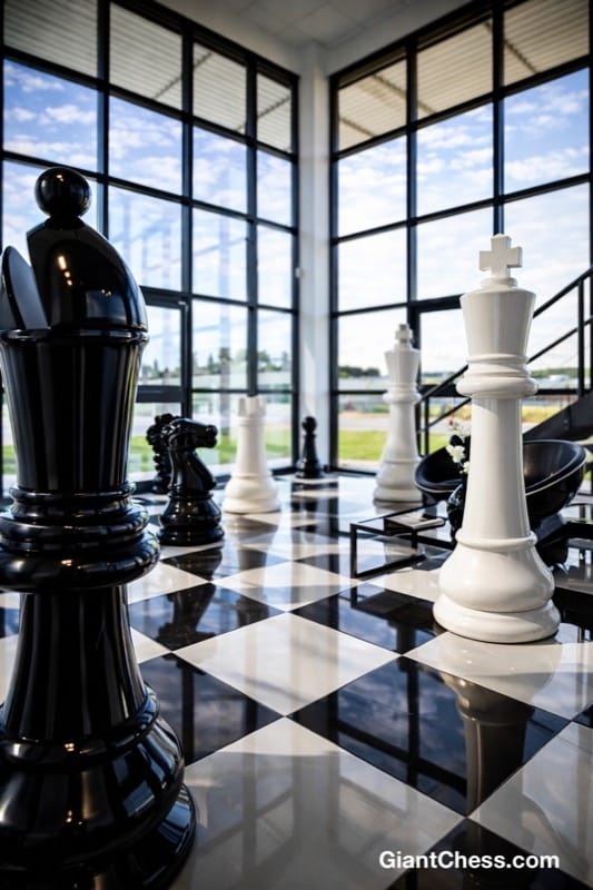This chess set - the largest standard size we produce - has a 72" (6' tall) king. It is most often used for outdoor decoration, but can also be used for indoor decor. Play with it is also possible, on a board with minimum 24" x 24" squares, especially if you wish to develop your physical fitness along with mental!
