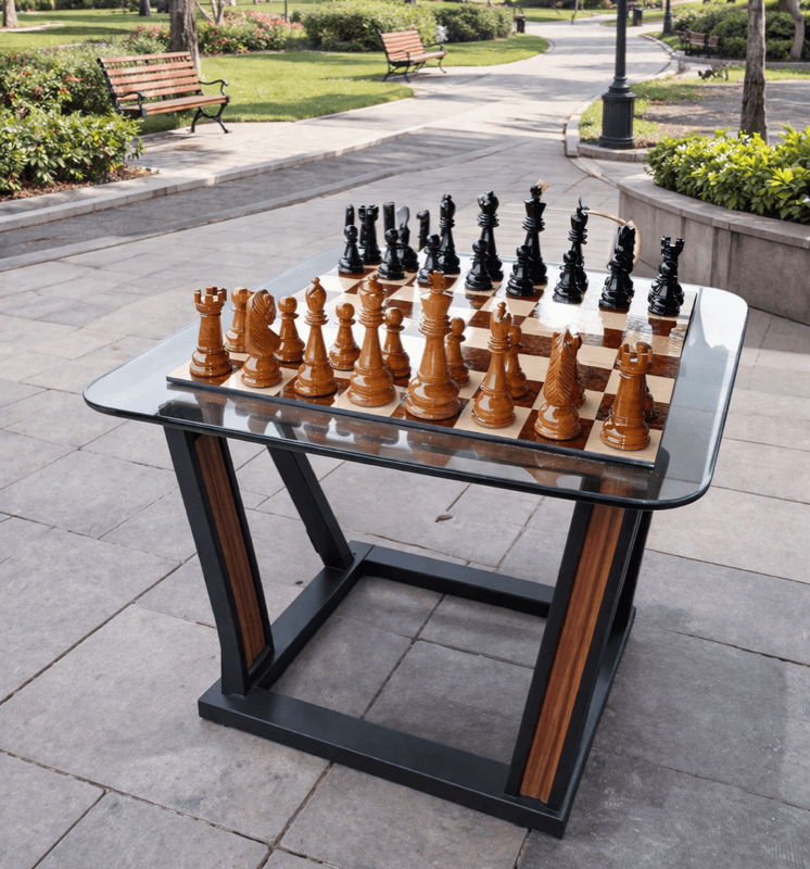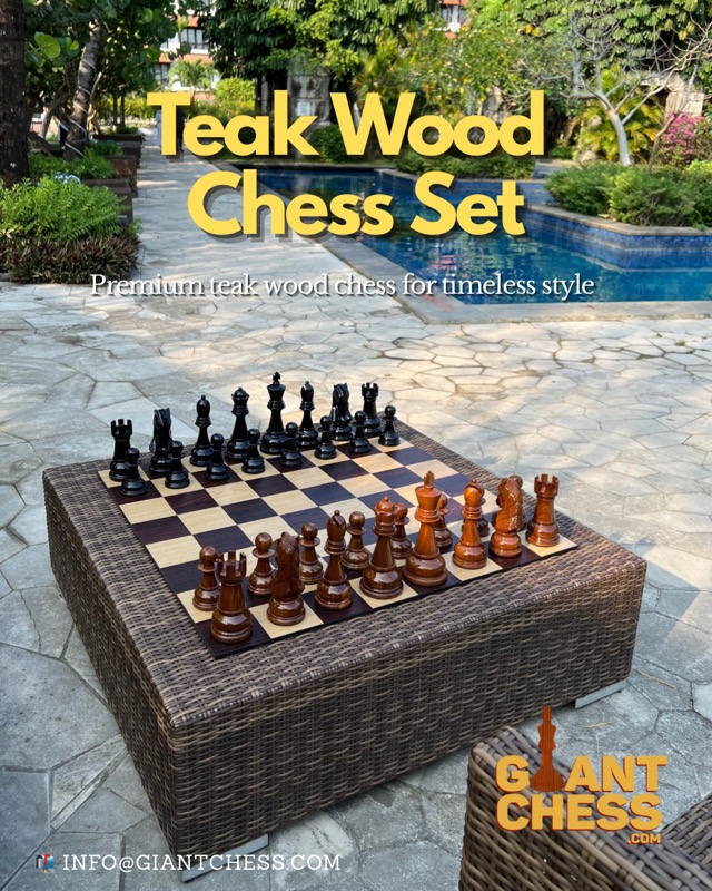 This 8″ (20cm) set is one of our best sellers. This is so not only because it is of classic design and made, as all our wooden sets, of beautiful and durable teak, but because it is suited for play in any setting, at any time, indoors or outdoors. It is easily stored and comes with portable fabric chess board with 4″ x 4″ (10cmx10cm) squares. It can all also be enjoyed with any of our beautiful teak chessboards, or chess tables (as pictured).